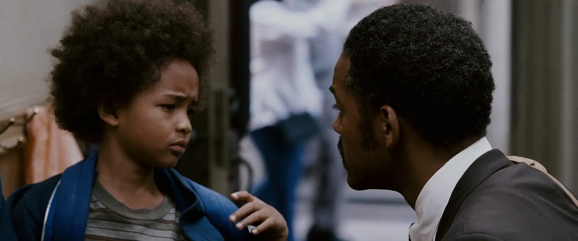Cast: Will Smith as Chris Gardner, Jaden Smith as Christopher Gardner, Thandiwe Newton as Linda Gardner, Brian Howe as Jay Twistle, James Karen as Martin Frohm, Kurt Fuller as Walter Ribbon, Dan Castellaneta as Alan Frakesh, Joe Nuñez as Driver Who Hits Chris, David Fine as Big Guy Rodney, Takayo Fischer as Mrs. Chu, Kevin West as World's Greatest Dad, George Cheung as Chinese Maintenance Worker, Geoff Callan as Ferrari Owner, Scott Klace as Tim Brophy, Rashida Clendening as Bus Driver, Peter Fitzsimmons as Doctor, Maurice Sherbanee as Roy The Old Neighbor, Zuhair Haddad as Cab Driver, Victor Raider-Wexler as Landlord, Mark Christopher Lawrence as Wayne, George Maguire as Police Clerk, Adam Del Rio as Shoe-Spotting Intern, Rueben Grundy as Businessman, Ming Lo as Young Executive, Stu Klitsner as Dr. Strauk, Esther Scott as Shelter Worker, Cecil Williams as Reverend Williams, Amir Talai as Clerk, Mike Garibaldi as Paul, Jason Frazier as Young Man - Bus Fight, David Haines as Other Young Executive, Bob Greene as Doctor at Oakland Memorial Hospital, Robert Anthony Peters as Glide Shelter Worker, Cathy Fithian as Policewoman, Keith Stevenson as Indian Grocery Clerk, Karen Kahn as Professional Woman, Yeena Fisher as Businesswoman (uncredited), Phil Austin as Stock Broker (uncredited), Kenny Santiago Marrero as Stock Broker (uncredited), David Pearl as Stock Trader (uncredited), Rick Camp as Bus Rider (uncredited), Brad Carr as Dean Witter Employee (uncredited), Ben Fritz as Dean Witter Trader (uncredited), Adam Wang as Dean Witter Trader (uncredited), Zachary Culbertson as European Tourist (uncredited), Brendan Kruse as Bike Messenger (uncredited), Austin Scott as Homeless Youth (uncredited), David Michael Silverman as Doctor at First Hospital, Domenic Bove as Tim Ribbon, Joyful Raven as Hippie Girl